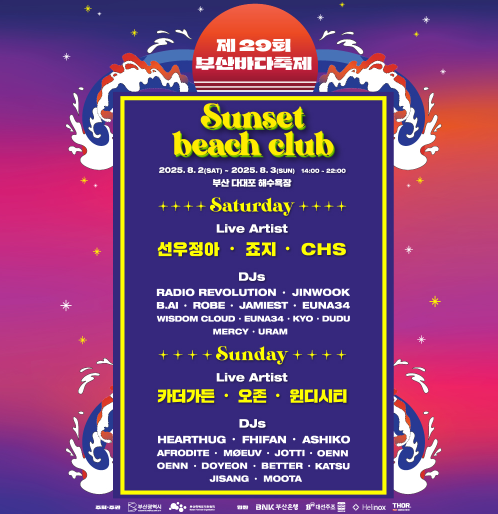 | 선셋비치클럽 | 8.2(토)-8.3(일) / 14:00-22:00 | 다대포해변 | EDM & 감성 음악의 해변 파티 |