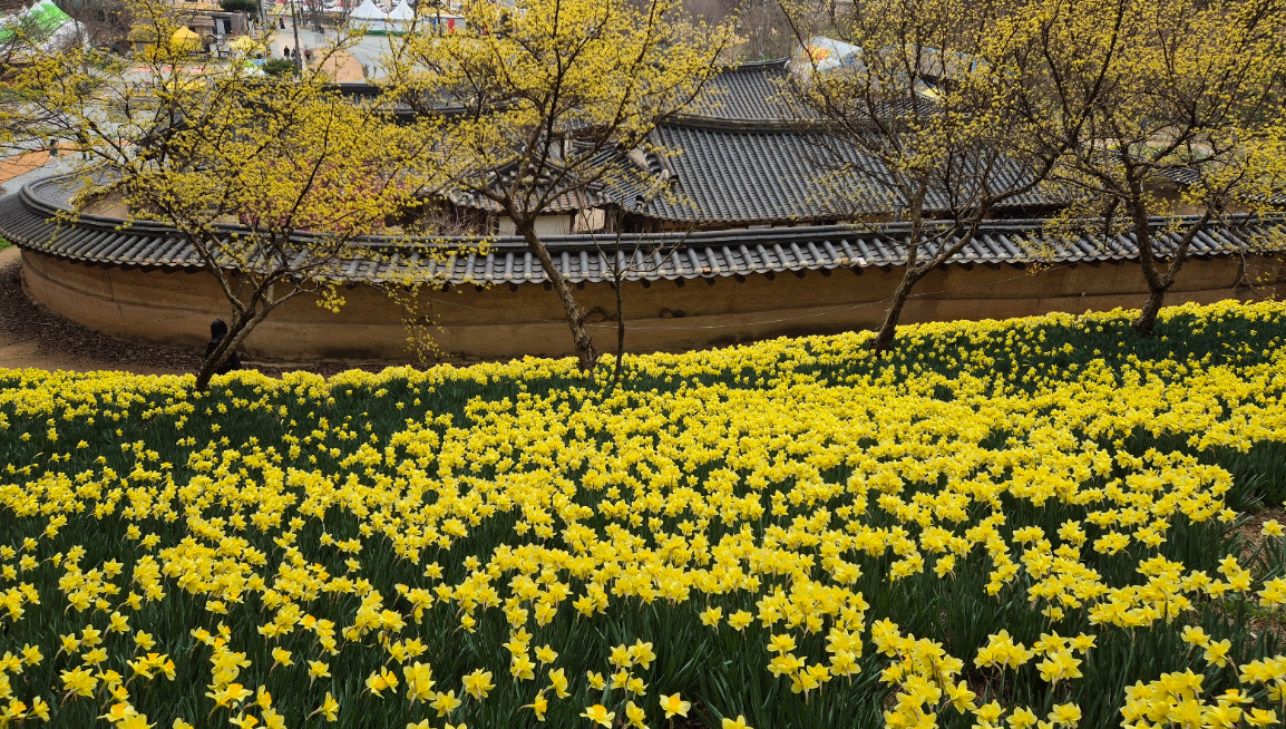 ※ 노란 수선화가 언덕을 가득 채우고, 그 아래에는 100년 된 한옥이 자리한 풍경.